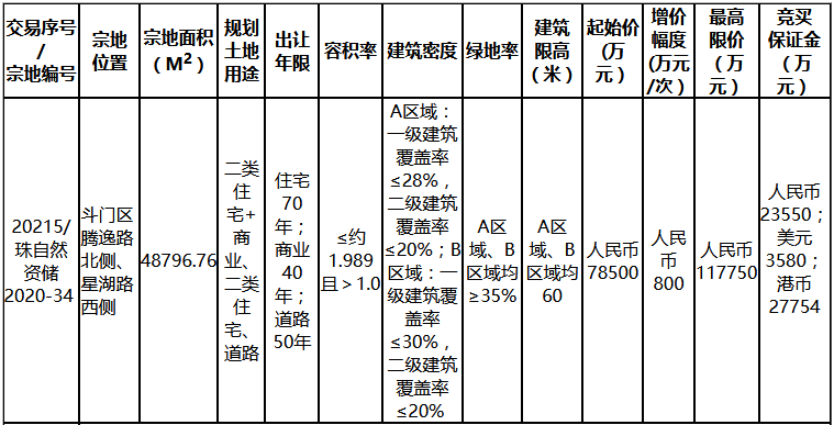 资料显示,该地块编号为20215/珠自然资储2020-34,位于斗门区腾逸路北侧、星湖路西侧。出让面积48796.76㎡,起始价7.85亿元,竞买保证金23550万元,最高限价117750万元。