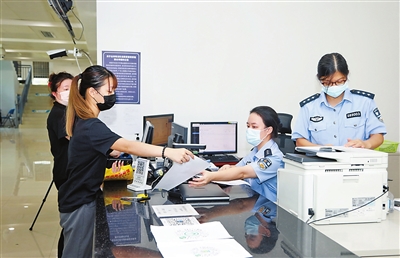 澳门居民在横琴粤澳深度合作区澳门机动车入出横琴申报大厅办理驾驶证换证服务。
