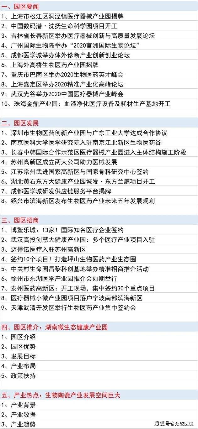 为了使园区能更及时全面地了解国内医疗器械园区的发展动态、产业发展热点,特编制《医疗器械园区资讯月报》。该资讯由众成医械研究院负责整理编辑,每月一期,涵盖医疗器械领域的园区要闻、园区发展、园区招商、园区推介、产业热点五个方面,供贵单位参阅。