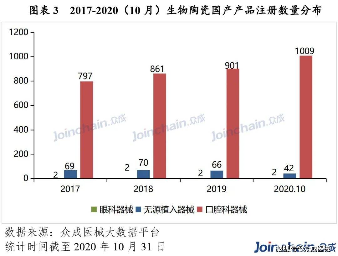依据2017-2020年生物陶瓷国产产品每年注册产品数量统计结果,口腔科产品(主要为义齿及制作材料)每年注册数量均有所提升,眼科产品(义眼台)数量维持稳定,而人工骨、人工关节等骨科植入器械产品数量呈下滑趋势。由于眼科器械和骨科植入器械制作精度高,技术水平要求严格,截至2020年10月底,两类器械仅占生物陶瓷产品大约4%,眼科和骨科生物陶瓷植入器械数量较少。