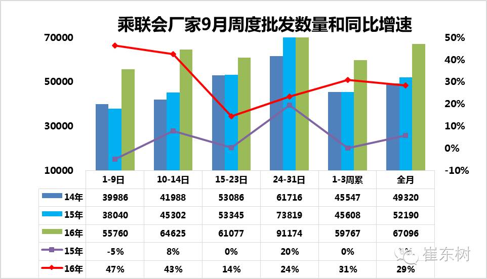 9月的批发走势持续较强,1-3周的批发达到5.9万台/日均销量有较强表现,第四周的批发表现仍是很强,达到9万台/日。而1-9日的批发表现就开局较强,这也是经销商知道库存不足,去库存对消费者不是好事,没库存就没有促销,因此经销商也是在加速补充库存,确保旺季销售。第一周的批发同比增速47%,而第二周的时间短,增速应较低,但仍达到6.2万/日的超强水平,体现了库存的需求较强,在第三周已经开始交通部与公安部的针对商品轿运大货车的查超治理工作,部分运输企业很头疼,经销商也需要更好的与厂家合作并协同发展。零售的走强对冬季商品车运输能力带来较大考验,希望物流平稳。最后一周的批发较多,也是为长假的运输备货,把所有能运输的时间利用上。
